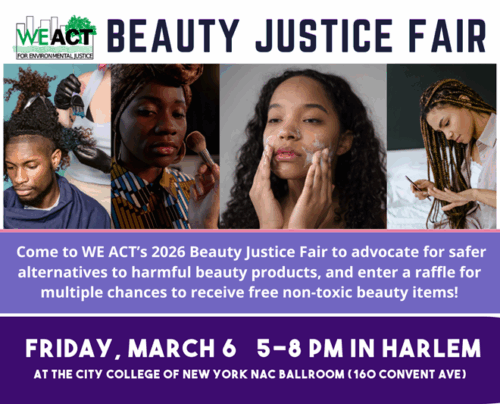 Come to WE ACT’s 2026 Beauty Justice Fair and learn about the dangers, how you can help advocate for safer alternatives, and receive free non-toxic beauty items. You can also learn about colorism and racism in the beauty industry and the importance of passing the New York State Beauty Justice Act while exploring hands-on activities, creative projects, and DIY stations. In addition, we will have local clean beauty businesses on-hand and offer free food, drinks, and merch!